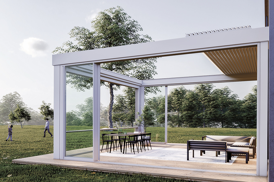 Een intrekbare bioklimatologische pergola met perfect afgedichte lamellen.